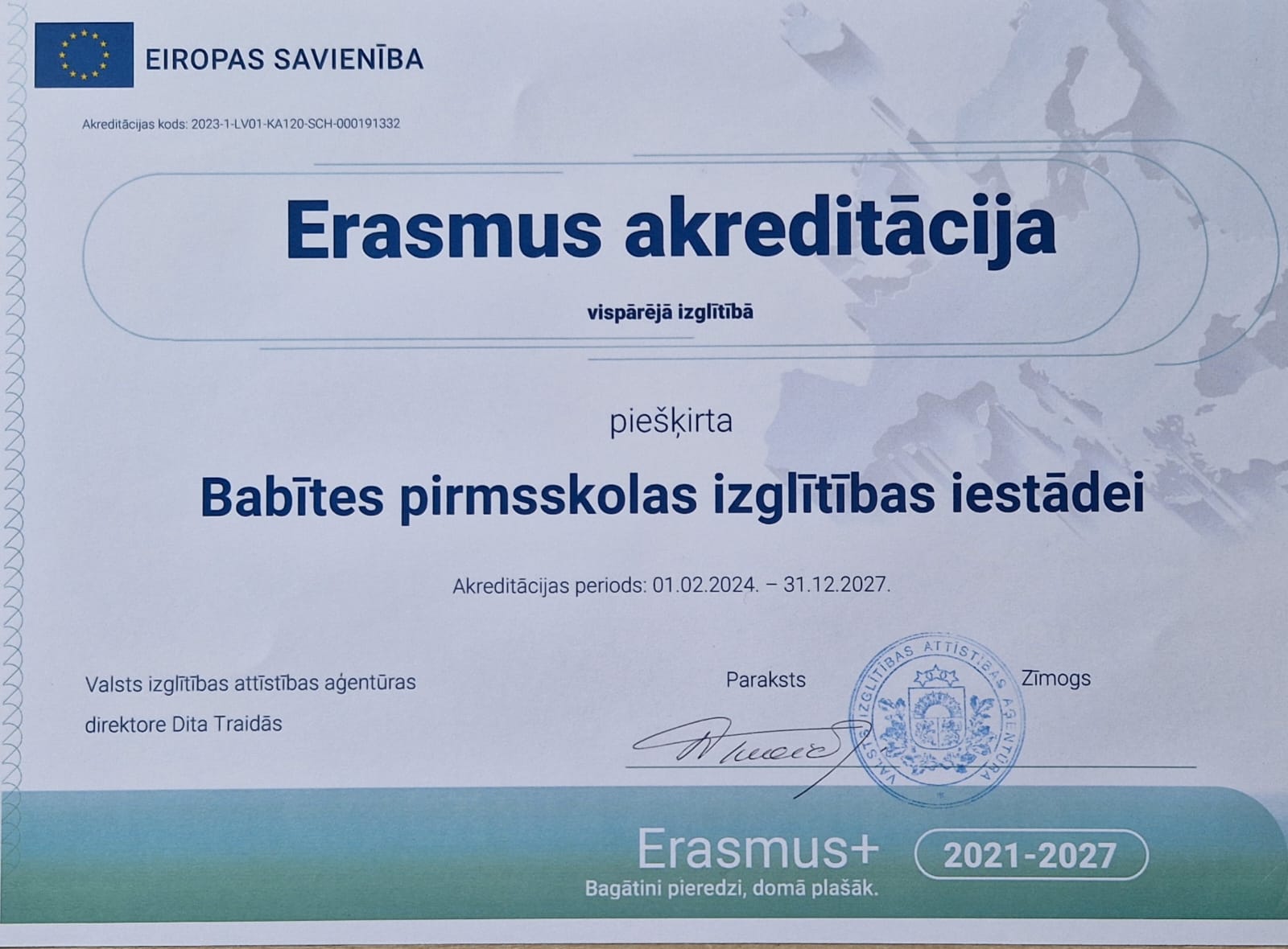 Kopš 2018.gada Babītes pirmsskolas izglītības iestāde – OID E10135506 – piedalās Eiropas Savienības Erasmus+ programmas projektos. 2024.gadā saņemta arī Erasmus akreditācija līdz 2027.gadam. Sadarbības projektu partneri aptvēruši plašu Eiropas ģeogrāfiju – Somija, Zviedrija, Ungārija, Itālija, Portugāle, Rumānija, Bulgārija, Spānija, Grieķija. Projektu īstenošanas laikā mācīsimies paši, dalīsimies pieredzē ar kolēģiem no citām valstīm, meklēsim jaunas idejas, ko īstenot mūsu ikdienas dzīvē. Projekti Babītes PII dzīvē ienes jaunas krāsas un izaicinājumus, tie veicina izglītības iestādes attīstību un pilnveido mācību procesu.
